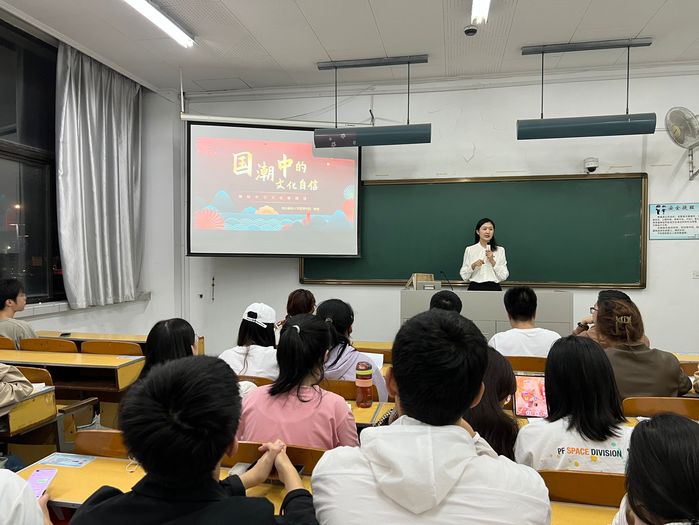 捷老师首先指出,近年来国潮文化”盛行表现出当代中国人文化寻根意识的觉醒,生动地展示新时代的新气息、新气象;同时优秀文化作品的百花齐放,展现出新时代中国特色社会主义波澜壮阔的奋进过程,呈现出中华文化应有的态度、广度、厚度和温度。随后,鲍老师分析了如何坚持文化自信她指出,要以文化自信强基因以文化自省固根本以文化自强向未来。最后,她要求青年一代要以大历史观审视中国特色社会主义文化的历史渊源,身体力行地践行社会主义核心价值观,进一步传承和弘扬中华优秀传统文化和中华文明的精神价值。