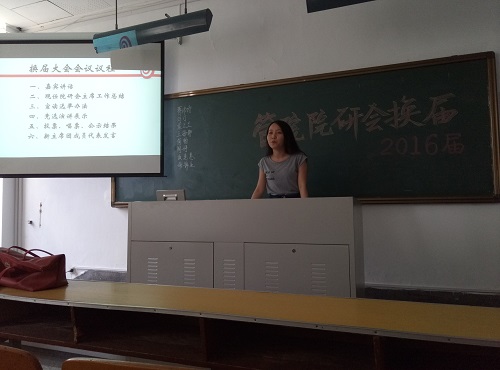最后,新一届的304am永利集团官网研究生会主席蒋沛诗同学代表主席团成员发表感言,感谢大家给予的信任与支持,并表示将传承研会的优良传统,带领新一届的研会同学继续努力创新,将管院研会越办越好。至此,304am永利集团官网2016届研究生会换届大会取得圆满成功。