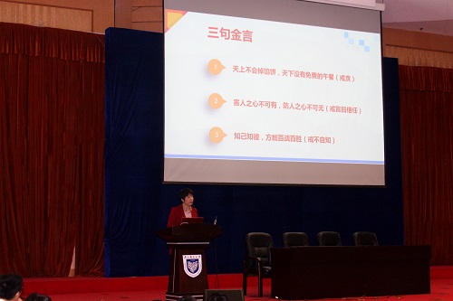 首先,邓艳华副书记从国庆节期间发生的一起兼职诈骗案开篇,分析“黑中介”的诈骗伎俩,传授破解的方法,语重心长地告诫同学们面对形形色色的物质诱惑,时刻保持清醒的头脑,遇到问题不要轻信,三思而行。接着,邓书记总结了大学生易发生的安全问题,如兼职诈骗,电信诈骗,不良网络借贷,传销陷阱等,并结合鲜活的案例进行了具体的分析,强调大学生通过做兼职来丰富自己的经历值得肯定,但寻找兼职岗位尤其毕业生在网络求职时应通过正规渠道,仔细辨别,防止上当受骗。最后邓书记送给在场的同学们三句金言——天上不会掉馅饼;害人之心不可有,防人之心不可无;知己知彼,方能百战百胜,告诫同学们要做到戒贪,戒盲目自信,戒不自知。