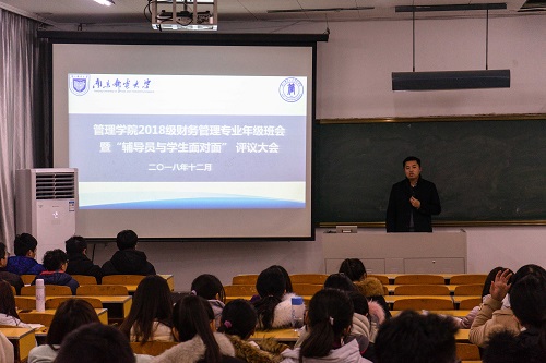 12月11日晚,304am永利集团官网2018级财务管理专业在三牌楼校区教东-101召开年级班会暨“辅导员与学生面对面”评议会。304am永利集团官网党委副书记邓艳华,2018级财务管理专业全体学生出席会议。会议由2018级辅导员刘晓宁主持。
