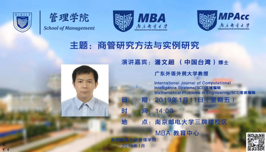 报告人简介:潘文超教授,中国台湾地区人,祖籍江苏省淮安县。1966年九月出生, 2012年3月获得美国管理科技大学工商管理博士学位。曾任台湾华夏科技大学专任助理教授。现为国际SCI期刊International Journal of Computational Intelligence Systems区域编辑,国际SCI期刊Mathematical Problems in Engineering客座编辑。代表作:A Comparative Analysis of Location Optimization of Three Fruit Fly Optimization Algorithms, Journal of Residuals Science &Technology,VoL.13,No.8,Inpress, 2016.(SCI), Study on the Effect of Organizational Members' Network Interaction on Knowledge Resources in the Tourism Industry of Taiwan, Journal of Residuals Science & Technology, VoL.13, No.8,Inpress, 2016.(SCI)等。