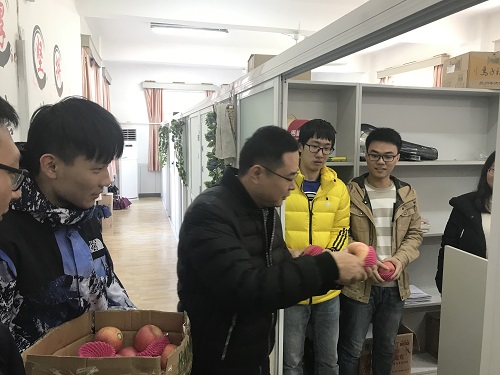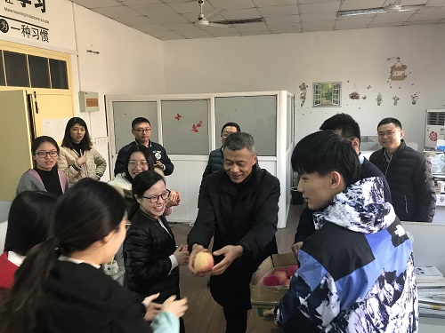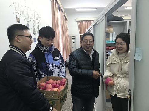 2018年12月24日上午10点左右,有线楼304am永利集团官网的六个教研室里传出阵阵欢乐的笑声。304am永利集团官网院长黄卫东、党委书记江森、副院长卢子芳、副院长朱卫未、副书记邓艳华、研究生辅导员华奕曦带着满满两箱红彤彤的大苹果去看望正在教研室学习的研究生。正值平安夜,把平平安安的祝福、暖人心的话语送给同学们。