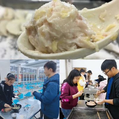 在菜市场的阿姨的热心帮助下,大家准备好了饺子皮和馅料,食堂二层的工作人员也给予了很多支持,帮忙煮饺子,还提供了碗筷和酱料。