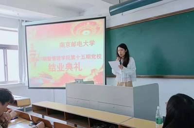 在庄严的国歌声中,结业典礼拉开序幕。典礼初始,唐捷老师宣读本次党校优秀学员名单。优秀学员代表蒋妍同学上台发言,她分享了自身在党课学习中所受到的感悟和启发,并且代表全体学员表示,在今后的学习与生活中将按照党和人民要求不断锤炼和完善自己,努力做新时代具备过硬本领和高尚品格的共产主义接班人。