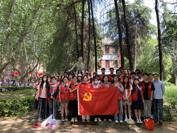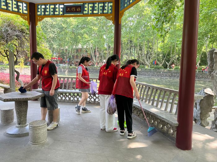 活动伊始,党支部书记王超老师向大家简要介绍了本次党日活动的目的与意义。活动期间,党员同志们积极清扫了三好亭、四方亭、金川亭、紫藤长廊以及梧桐大道等地同时,对学校里的《晨读》雕塑进行了重点清洗,令其焕然一新,也使得校园平添了更多的生机。天气虽然炎热,但是党员同志们志愿服务的热情却不减,一个个“红色马甲”频繁出现在校园的各个角落。