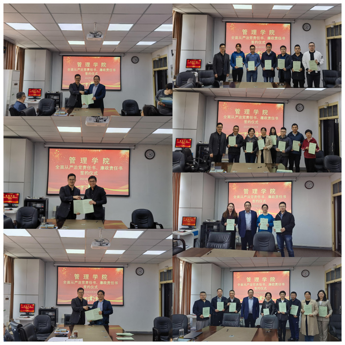 在与会人员的见证下,学院党委书记钟凯与学院领导班子成员、党支部书记、系部中心负责人签订全面从严治党主体责任书;院长黄卫东与非党员系部中心负责人签订廉政责任书。
