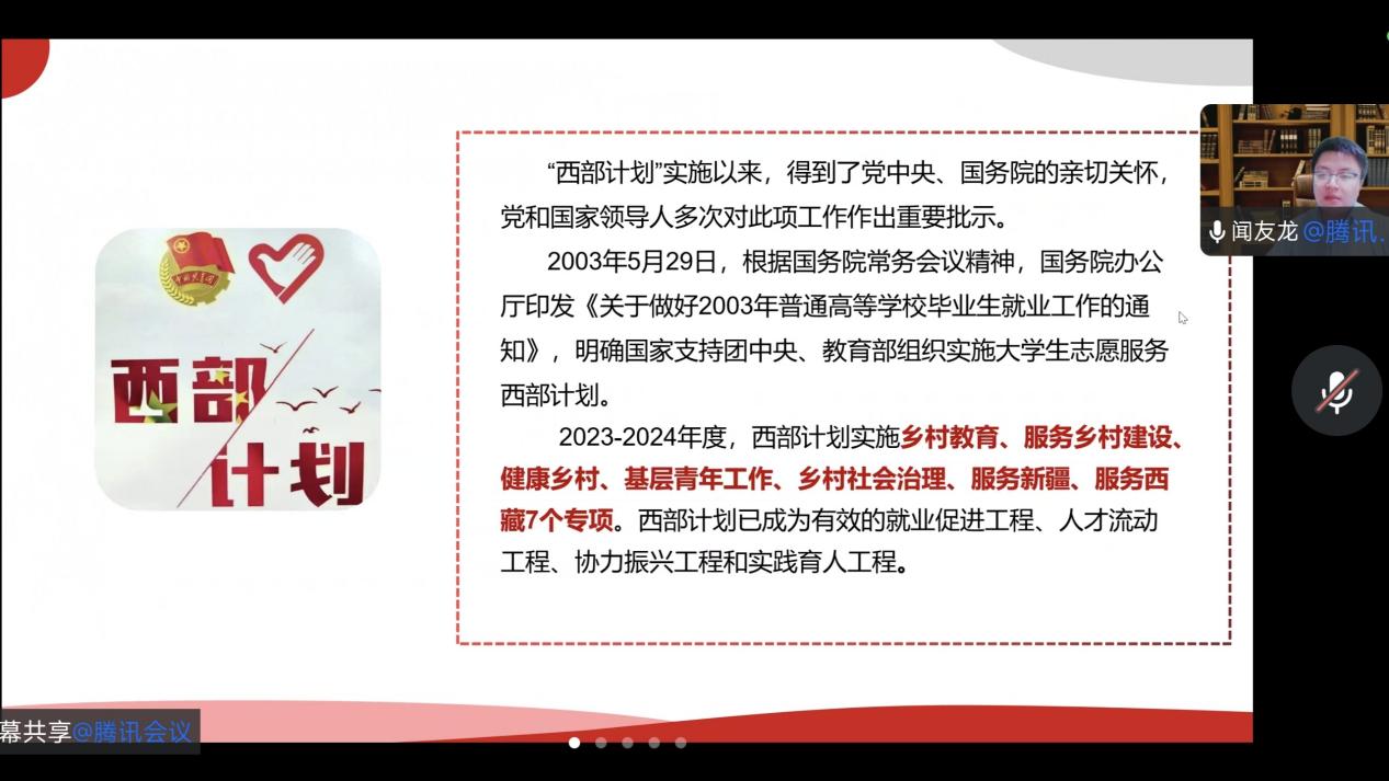 为引导广大毕业生前往基层建功立业、助力国家经济社会发展,4月16日晚,304am永利集团官网通过腾讯会议开展2024届基层服务项目专场宣讲会,邀请校团委素质拓展部闻友龙老师进行服务基层项目政策宣讲。学院党委副书记、副院长郭强,分团委书记鲍捷出席宣讲会,2024届毕业班辅导员、意向报名学生及部分家长代表等参与专场宣讲活动。