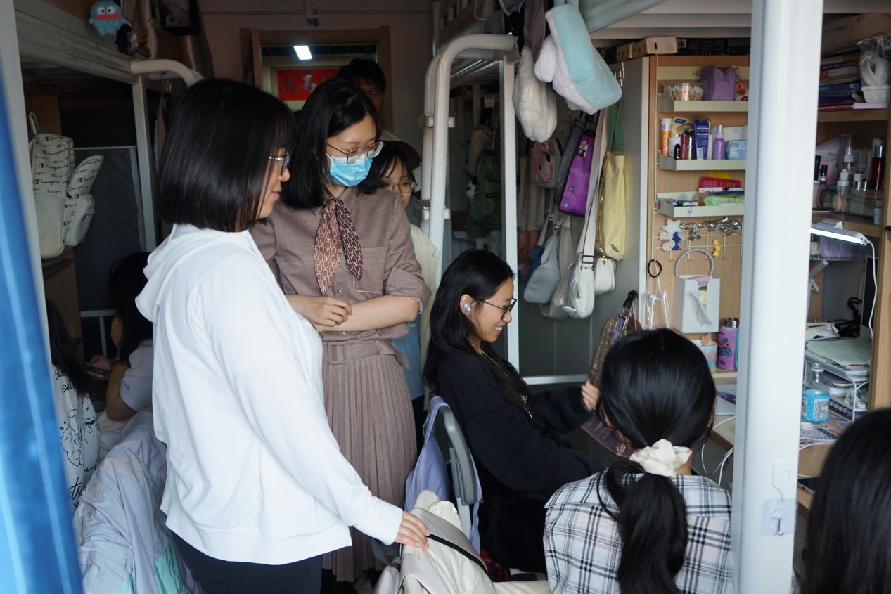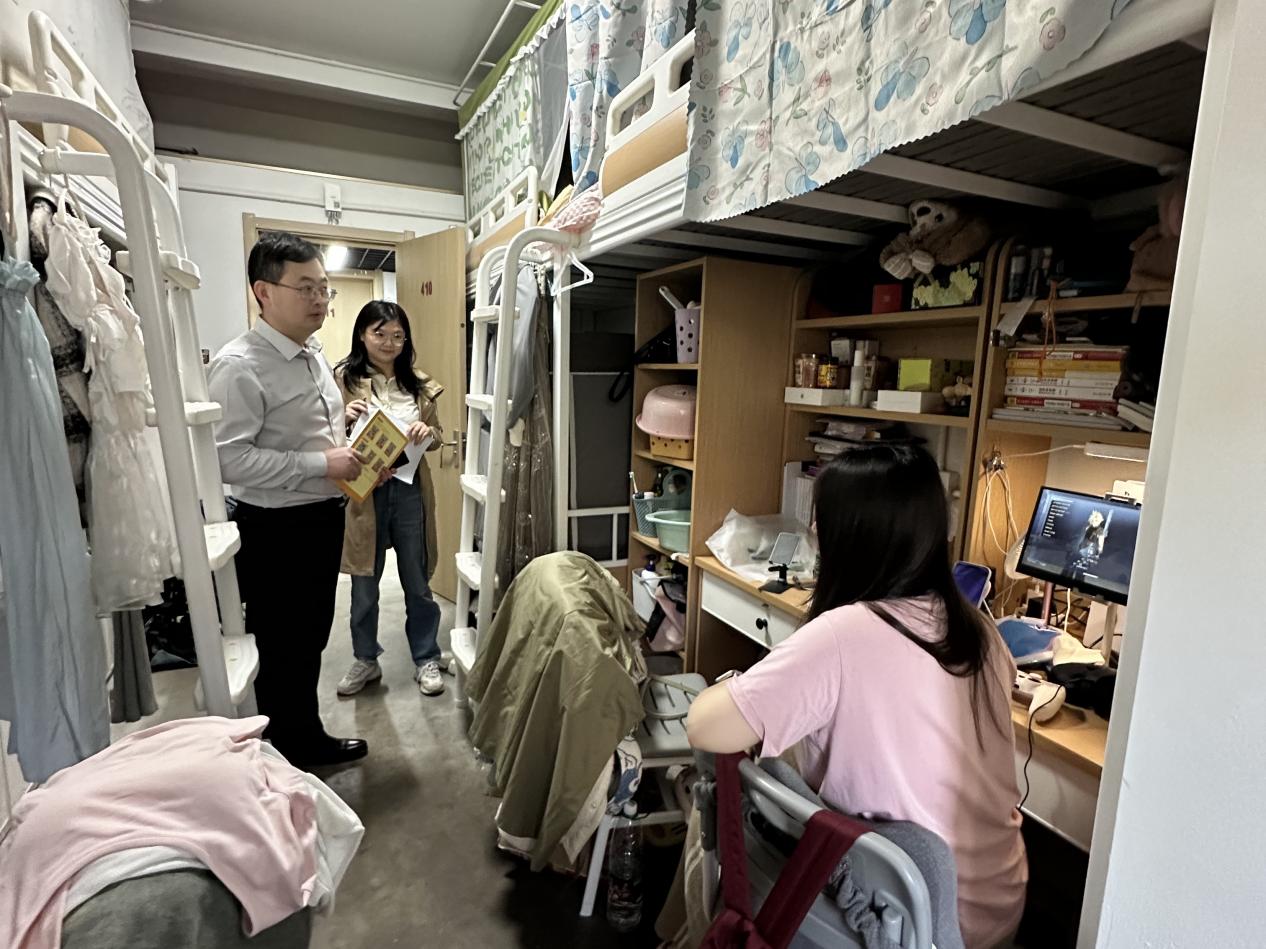 在检查走访中,郭书记同在宿舍学生亲切交流,详细了解学生的学习、生活情况,鼓励尚未确定去向的毕业班同学抓住春招尾声、积极争取岗位机会,勉励低年级同学要在学期过半之际全面梳理本学期的学业情况、及时查漏补缺,为课程结课考试做好准备。郭书记和辅导员在检查走访中提醒学生季节交替之际要注意宿舍卫生、食品存放、空调温度等问题,避免因此产生矛盾;同时在五一假期即将到来之际,提醒同学们要合理安排假期生活,离校同学务必履行好请销假手续并按时返校,并预祝大家度过一个安全、祥和的五一小长假。