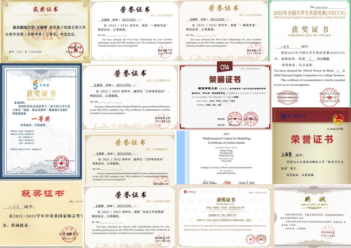 她勇于探索,积极参与科研竞赛,获全国大学生市场调查与分析大赛国家级一等奖、全国大学生英语竞赛国家级三等奖等省部级及以上奖项10余项。作为项目负责人,主持国家级大学生创新创业训练计划,发表学术论文两篇,项目以优秀结项。她热心学生工作和志愿服务。担任团支书期间,组织策划了“学习习近平总书记五四重要寄语精神”等主题团日活动,支部连续两年对标定级为五星级团支部,荣获校“先进团支部”“暑期三下乡社会实践先进个人”等荣誉。曾任学生会权益服务部部长,组织“邮你赢未来”“315消费者维权”等外场活动,累计参与志愿服务30余次。
