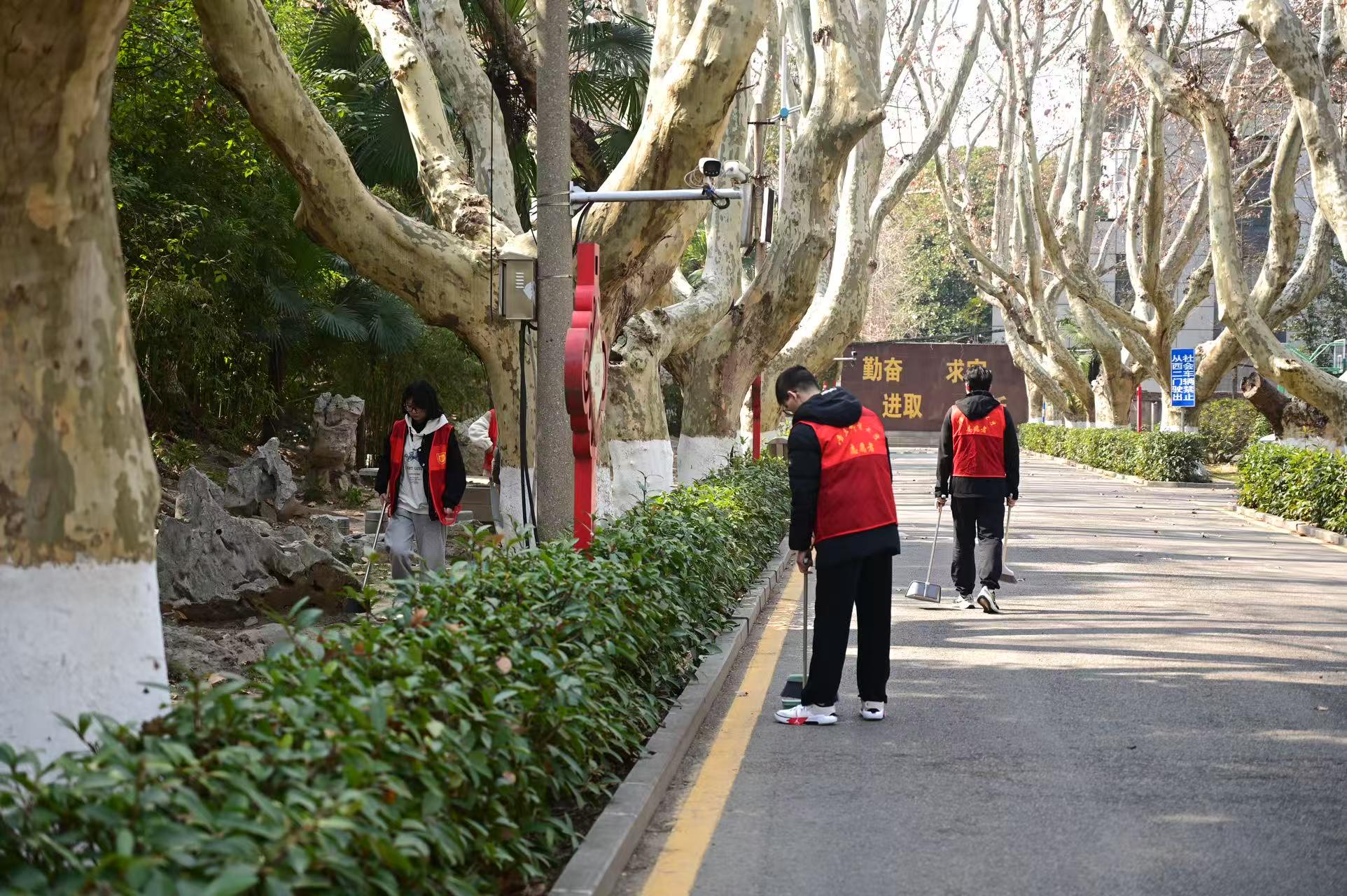 午后的阳光洒满校园,志愿者们身着统一的红色马甲,手持清洁工具,精神饱满地投入到校园清洁工作中。从图书馆前的广场,到眼镜湖周边的草坪,再到篮球场周边的休息区,处处可见他们忙碌的身影。他们认真清扫落叶,仔细擦拭公共设施,不放过任何一个卫生死角。在劳动过程中,志愿者们相互配合,默契十足,用实际行动展现了当代大学生的责任与担当。
