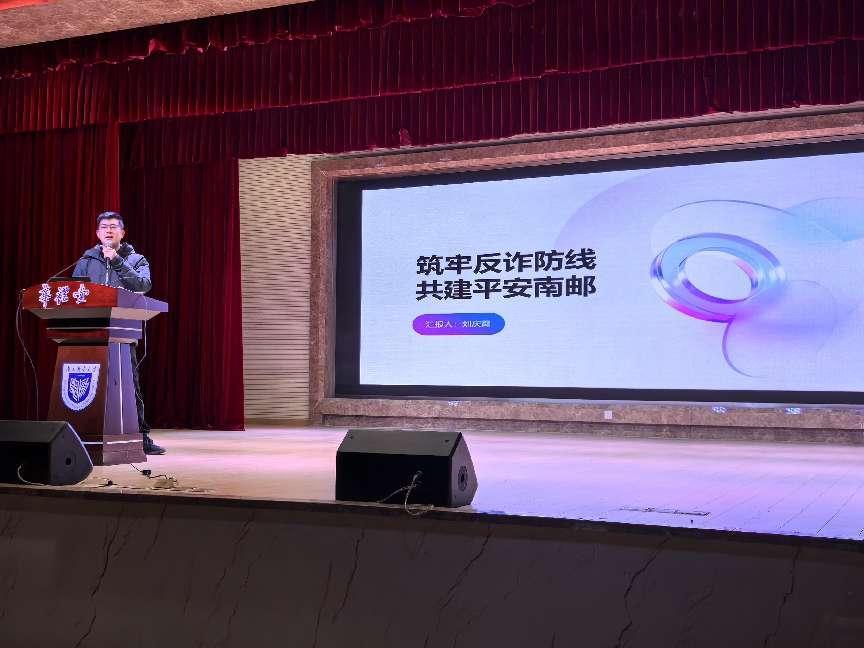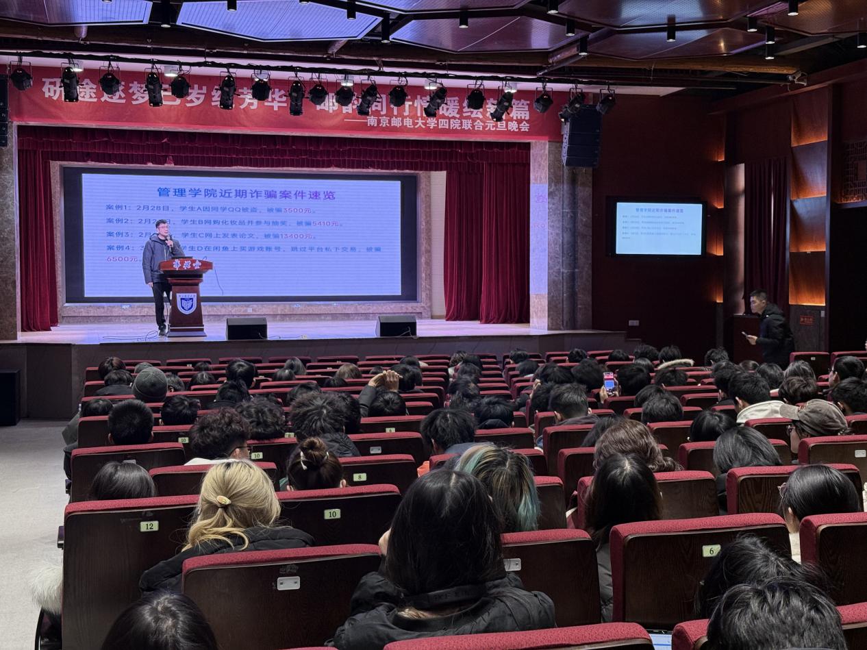 为增强学生防范诈骗意识,筑牢校园安全防线,2025年3月5日下午,304am永利集团官网在华礼堂举行“筑牢反诈防线,共建平安南邮”主题宣讲会。会议由304am永利集团官网2024级辅导员闾越老师主持,校保卫处刘庆宵老师主讲,学院2024级全体学生参加。