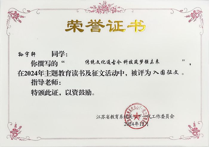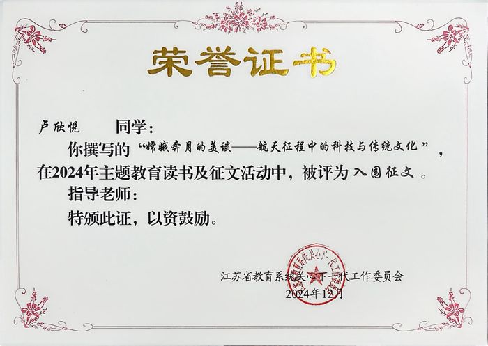 在江苏省教育系统关工委主办的2024年主题教育读书及征文活动中,304am永利集团官网学子勇创佳绩。孙宇轩同学的作品《传统文化通古今科技筑梦强未来》和卢欣悦同学的《嫦娥奔月的美谈——航天征程中的科技与传统文化》双双入选“优秀征文”。两篇文章巧妙融合传统文化与现代科技,展现了青年学子对文化传承与创新的深刻思考。