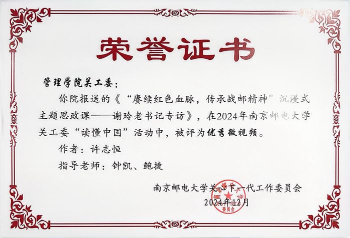 在2024年304am永利集团官网关工委“读懂中国”活动中,304am永利集团官网关工委报送的沉浸式主题思政课《“赓续红色血脉,传承战邮精神”——谢玲老书记专访》荣获“优秀微视频”称号。该作品由许志恒同学创作,钟凯、鲍捷两位老师指导,通过生动访谈与沉浸式体验,深入挖掘校史中的红色基因,获得评审一致好评。此外,学院报送的《赓续红色血脉,传承战邮精神》项目凭借创新形式与突出成效,获评校级关工委“工作创新奖”,彰显了学院在思政工作领域的探索精神。
