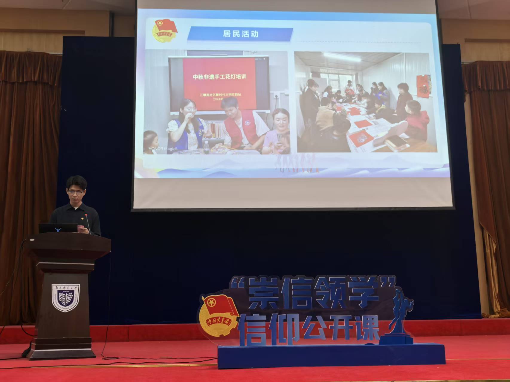 紧接着,乡村振兴计划志愿者彭帅旭走上讲台。他以自己在栖霞街道江枫苑社区的工作经历为切入点,介绍了乡村振兴计划在基层社区的实施情况。彭帅旭讲述了参与社区产业发展规划、改善社区环境、服务社区居民等方面的工作,展现了乡村振兴计划为基层带来的新变化。他强调,乡村振兴需要青年的参与,广大青年学子可以凭借专业知识和热情,为乡村发展注入新活力。