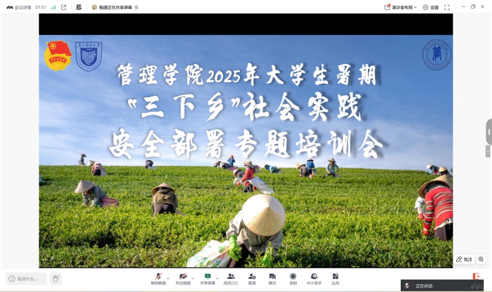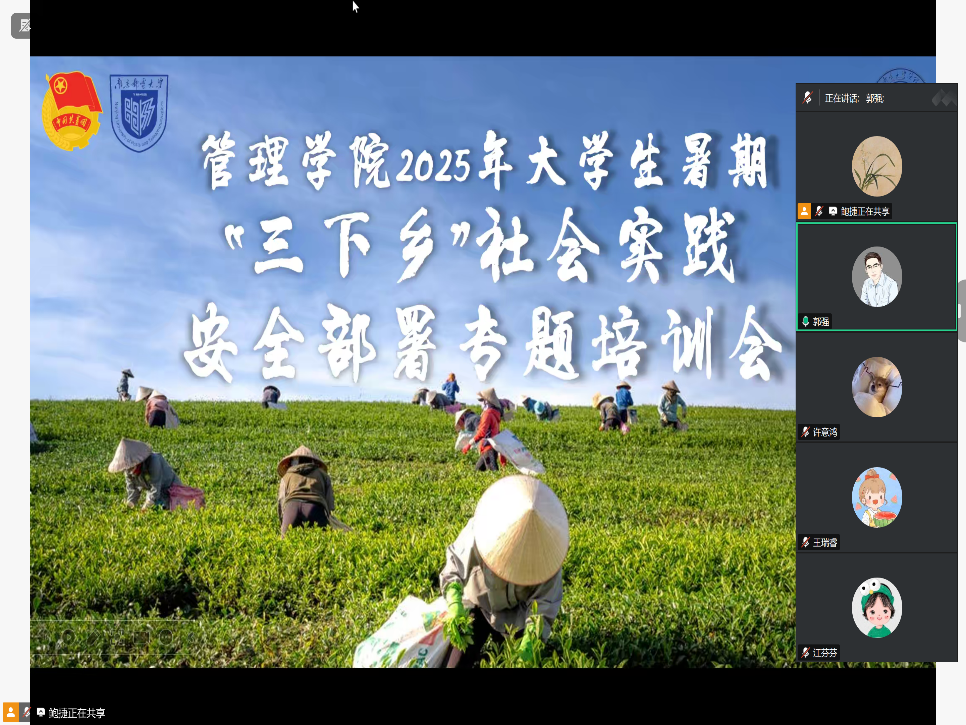 为深入贯彻落实团中央关于暑期社会实践工作的相关要求,引导青年学子在社会课堂中受教育、长才干、做贡献,7月6日晚,304am永利集团官网线上召开2025年大学生暑期“三下乡”社会实践安全部署专题培训会。304am永利集团官网党委副书记、副院长郭强教授,各实践团队指导老师出席会议。会议由学院团委书记鲍捷主持,各实践团队队长参会。