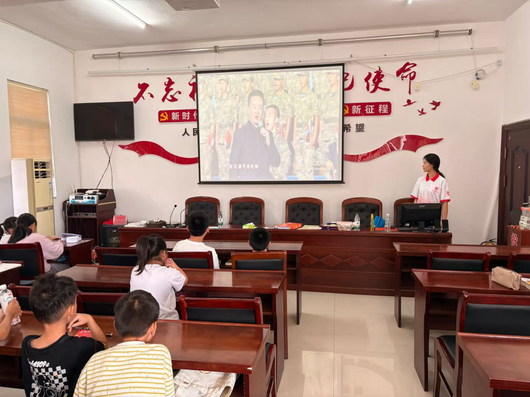 “听吧新征程号角吹响!”纪录片余韵未消,《强军战歌》的旋律已响彻教室。实践团成员化身“音乐教官”,逐句教唱,解析歌词中“山河无恙”的家国情怀。当唱到“不惧强敌敢较量”时,孩子们自发挺直腰板,握紧拳头,歌声如浪潮翻涌。六年级的浩浩主动上台指挥,手臂挥动间竟有几分飒爽英姿。“我要当解放军,保卫祖国!”课后几个男孩围着队员,眼神亮如星火。